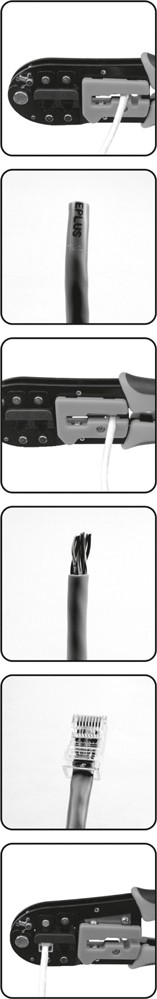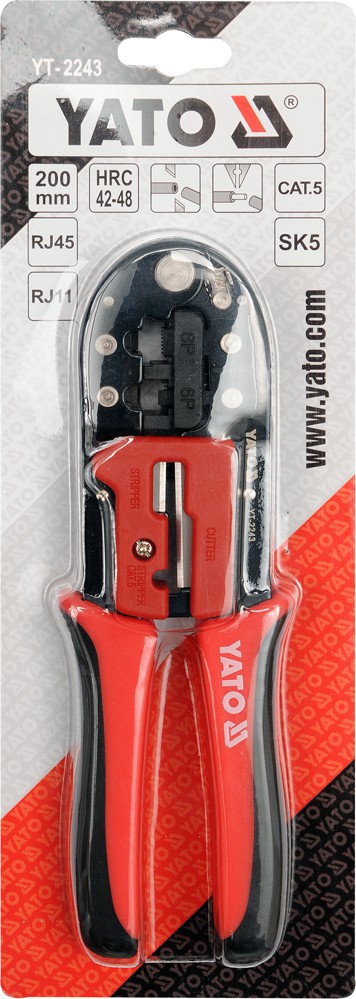 Crimping tool for 6P RJ11 and RJ45 type 6J telephone terminals with cable cutter, CAT.5 cutter and SK5 insulation cord with HRC42-48 hardness. Comfortable and ergonomic handle. Length 200mm.