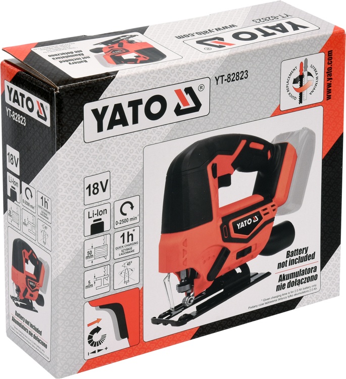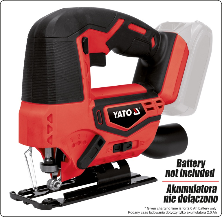 18V JIG SAW; SPEED: 0-2500 SPM; STROKE: 20MM; PENDULUM; CUTTING DEPTH: 50MM IN WOOD; 5MM IN METAL; DUST BLOW FUNCTION; ADJUSTABLE BASE 0-45 DEGREES; PARALLEL CUTTING GUIDE INCLUDED; 1PC BLADE 75MM FOR WOOD INCLUDED; WITHOUT CHARGER AND BATTERY